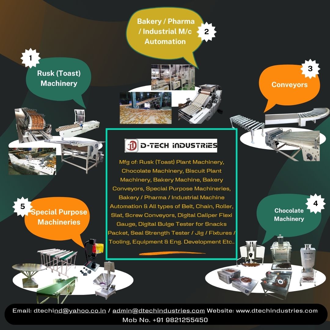 Mfg: of Rusk (Toast) Plant Machinery, Chocolate Machinery, Biscuit Plant Machinery, Bakery Machine, Bakery Conveyors, Special Purpose Machineries, Bakery / Pharma / Industrial Machine Automation & All types of Belt, Chain, Roller, Slat, Screw Conveyors, Digital Caliper Flexi Gauge, Digital Bulge Tester for Snacks Packet, Seal Strength Tester / Jig / Fixtures / Tooling, Equipment & Eng. Development Etc